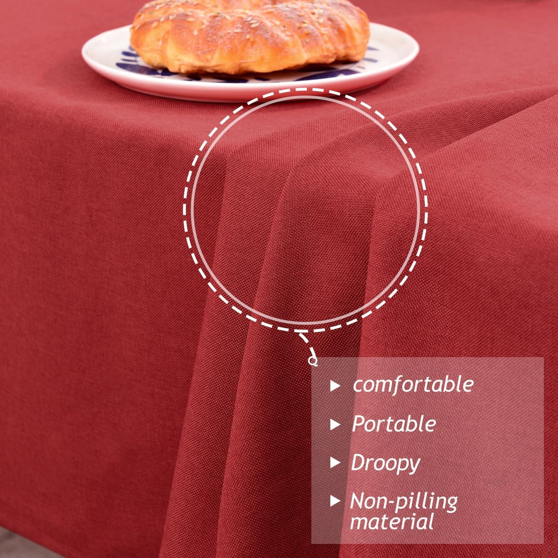 MAPLEORE Exquisite Tablecloths Rectangular feature the latest BFLM-23F faux linen fabric and a unique jacquard technique. The result is a stain-resistant tablecloth with a distinctive surface texture, boasting a concave-convex pattern and 3D effect for a sparkling experience.