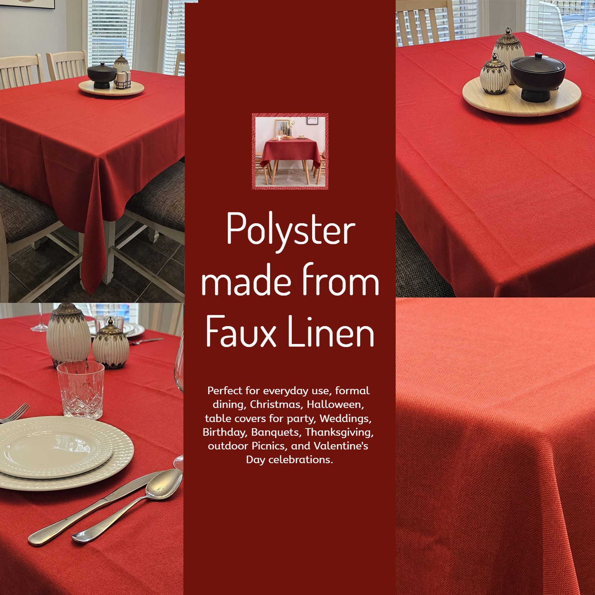 - MULTIPLE PURPOSES: Perfect for everyday use, formal dining, Christmas, Halloween, table covers for party, Weddings, Birthday, Banquets, Thanksgiving, outdoor Picnics, and Valentine's Day celebrations.
